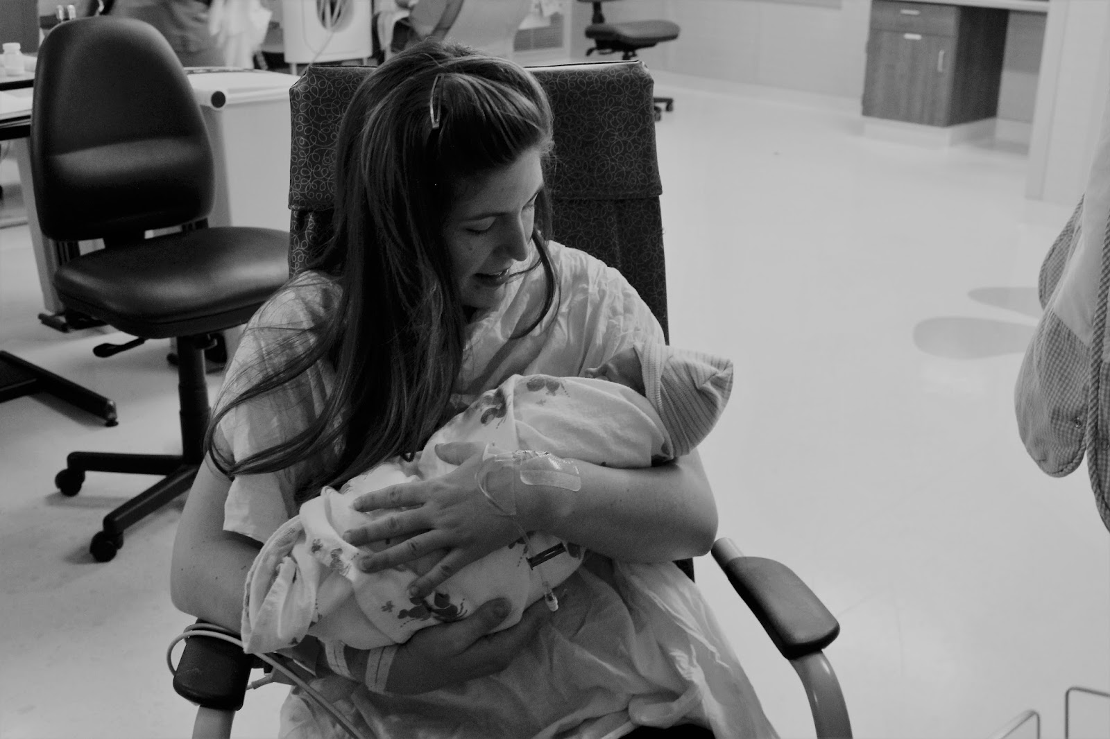 Time is a funny thing. I felt like I'd been in that room for days at that point, but once contractions got regular time flew by. I wish I'd eaten more, I got weak with a couple hours to go, but couldn't stomach anything other than coconut water. Things were intense for a while, and then suddenly they weren't and I was past the 24 hour mark by a couple of hours. I was scared of the threat of the knife, so my nurse started me back on a small dose of pitocin. A few minutes later, I recognized my old friend "transition." My nurse checked and I was only 7cm, but I told her I was very close and that I wanted to drop the bed so that I could use the squat bar if I needed it. She didn't take my haste seriously, and went to check her other patient and find a bed that worked (mine wasn't dropping correctly). Minutes later I told Bobby to get the doctor, she was coming! My mom helped me get into position and I told her "she's crowning!" My doubtful nurse pushed the new bed in, I think expecting to find me in transition. When she looked down and saw Lily's head starting to poke out, she finally got some pep in her step and called for doctor "right now!" Dr. Gibson had time to get one glove on just in time to catch Lily with my help. It was 10:20pm. Not a single push, not a single tear. It was everything I'd hoped and prayed for. She let out one little cry and nuzzled right into my arms, perfectly content. After the delivery crew finished cleaning up the downtown, Lily rooted, latched, and nursed for 45 minutes. It was so peaceful.